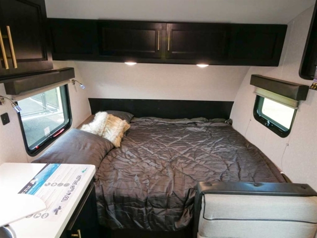 Weighing in under 3,000 pounds this 19’ travel trailer packs a lot of features in a small space. The rear entry design creates a split bath that allows you to use bath facilities simultaneously. Despite the trailers size nothing is lost in the kitchen which features a flush mount glass cook top, huge sink, ample counter space, and a segment leading 10.3 cu.ft. double door refrigerator. This unit is fully loaded with all four packages and with solar!