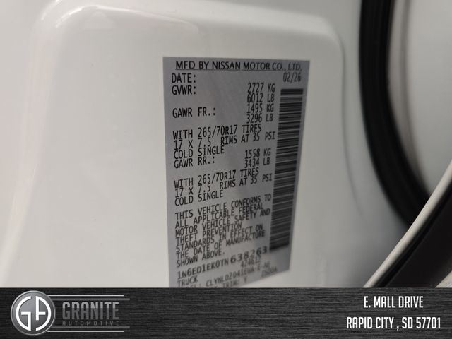 Pricing and availability may vary by dealer, options, add-ons and financing. See dealer for actual price and details. Price includes: $1000 - Nissan MWR Frontier (Pro-4X and SV) Bonus Cash - February. Exp. 03/02/2026 $2500 - Nissan Customer Cash. Exp. 03/02/2026