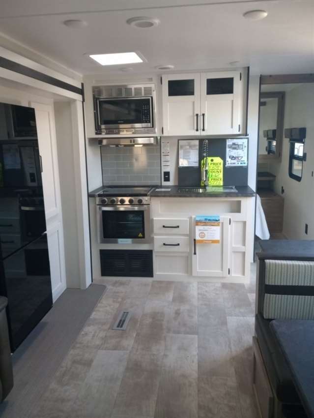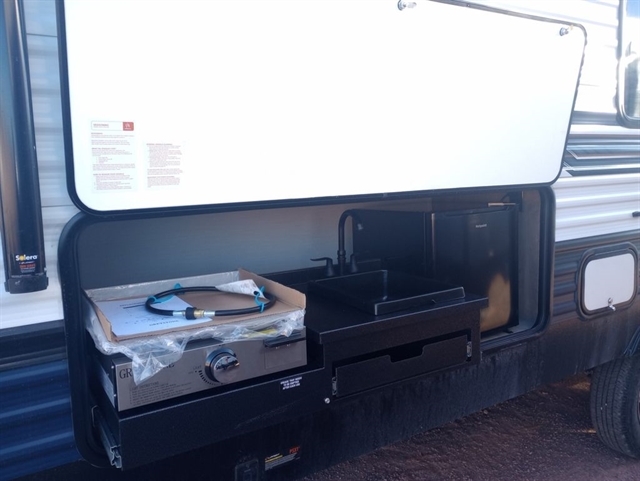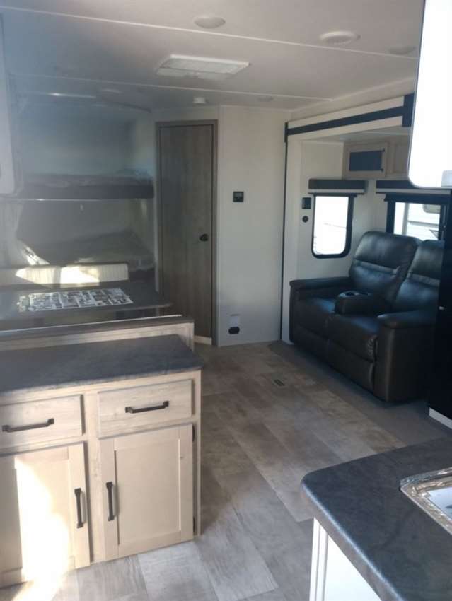 This Travel Trailer provides many areas for you and your guests to sleep. With double stacked beds in the rear, and a full size queen bed in the bedroom, feel free to invite all your friends and family. A slideout with a sofa and large walk-in pantry allow you to bring all your goods to make the perfect meal. A rear bathroom with a large shower grants you plenty of much needed space. Furthermore, an optional outside kitchen can be added for those of you who like to cook in nature.
