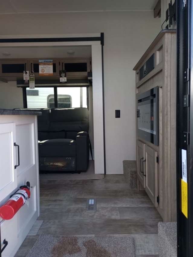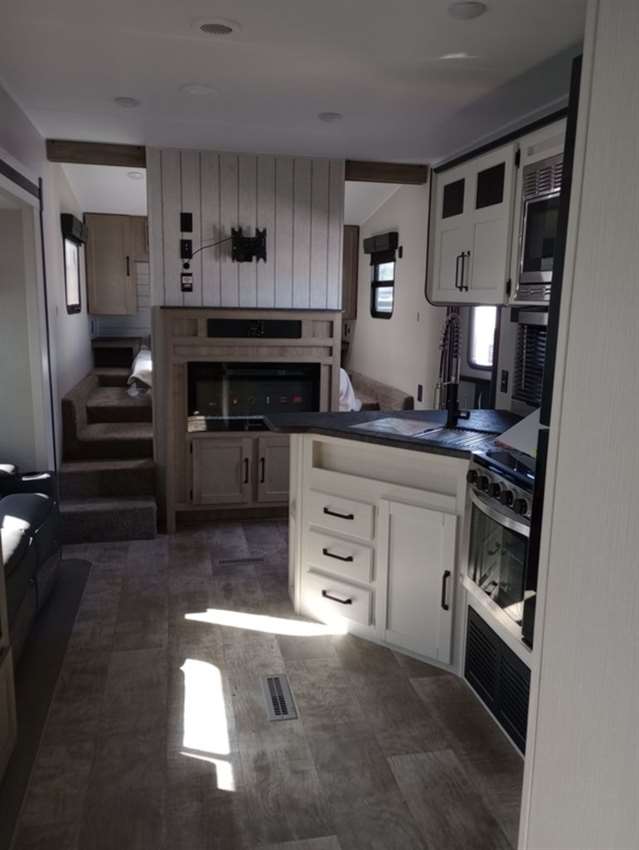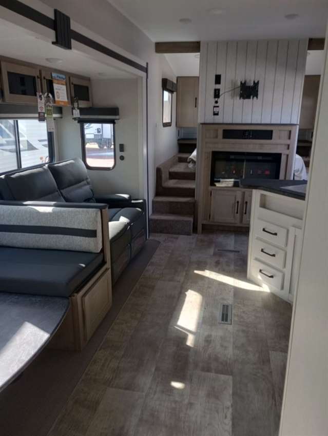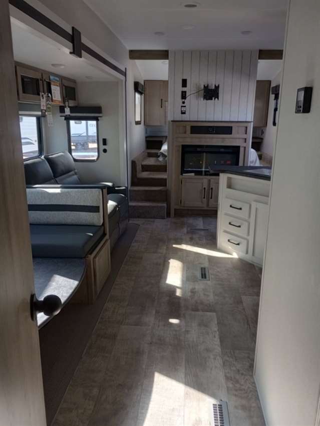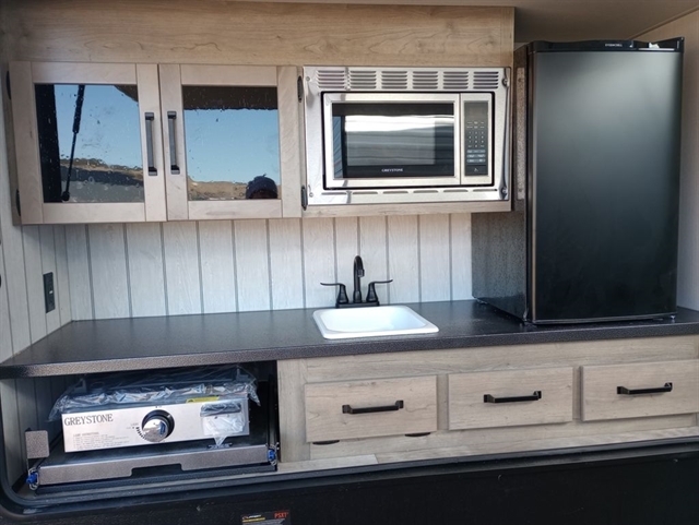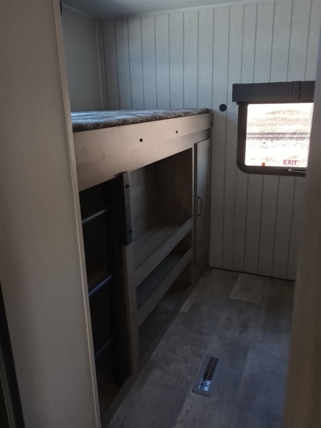 This rear bunk house Fifth Wheel gives you the ability to bring the whole group along. A bunk house with a slide out in the rear, a Dinette/Sofa slide in the center, and a full sized queen bed in the front grant you plenty of space. The Dinette and Sofa slide out also double as a great place to eat your meals while looking out the windows at the natural vista. For those of you who love the outdoors can furthermore make their meals in nature with the outside kitchen with a griddle.