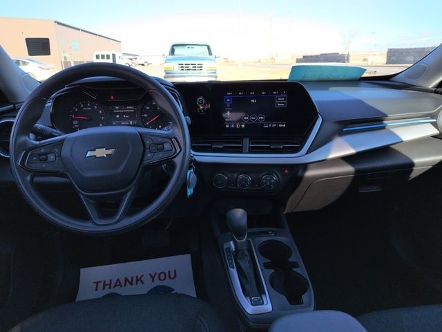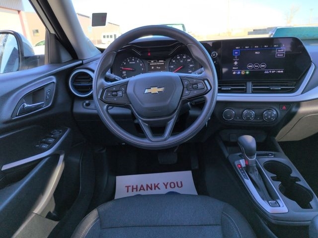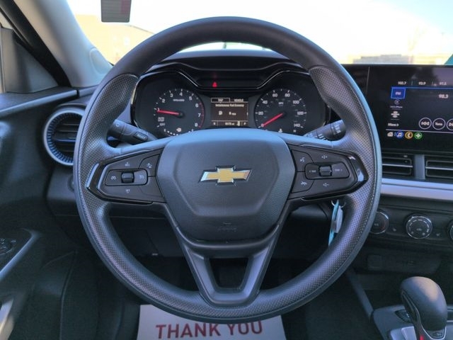 Inside, the cabin features a Jet Black/Gray cloth interior with blue accents, adding a sporty touch while maintaining comfort and durability. The LS trim focuses on practicality and value, making this Trax a great choice for drivers seeking reliability, efficiency, and modern design.