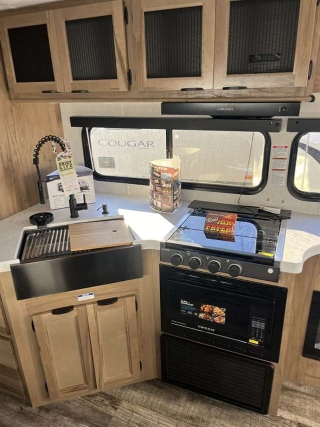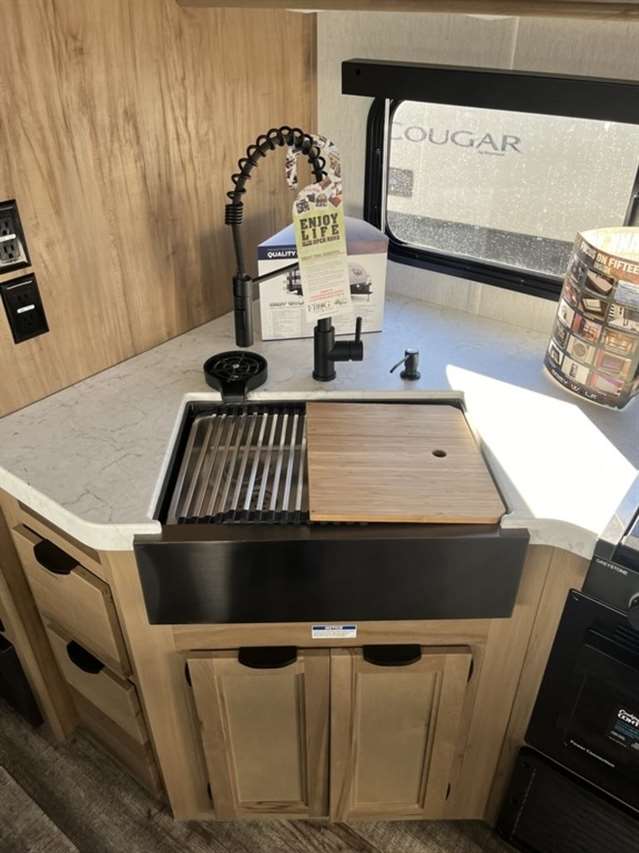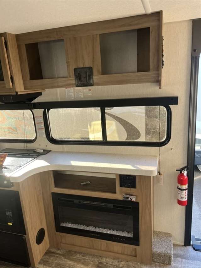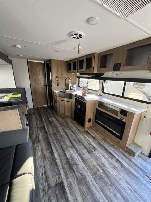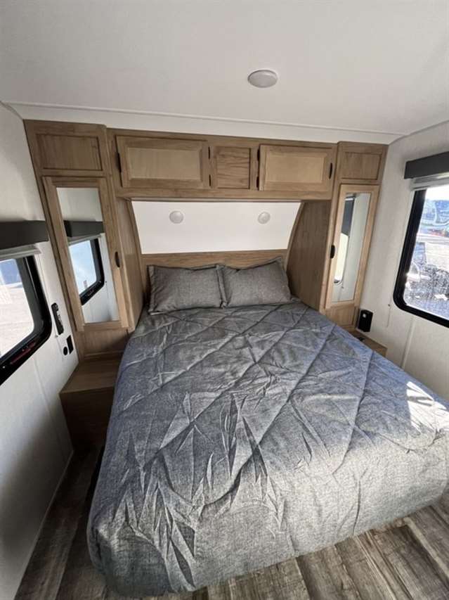 The 26DBH is the ultimate family camper, with a double entry and access to the bath from outside. The double bed bunk, with ladder, provides extra sleeping room for kids and adults. The modern custom kitchen, oversized full pantry and extra-large U-shaped dinette with full length drawers give you more than enough storage for camping gear and supplies. The exterior will provide a great entertaining space with the exclusive Cherokee camp kitchen, exterior speakers and TV bracket as well.