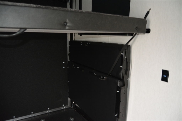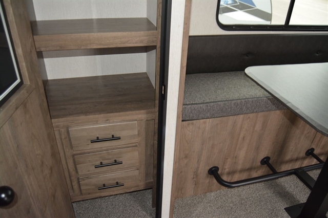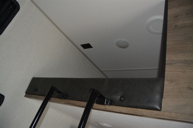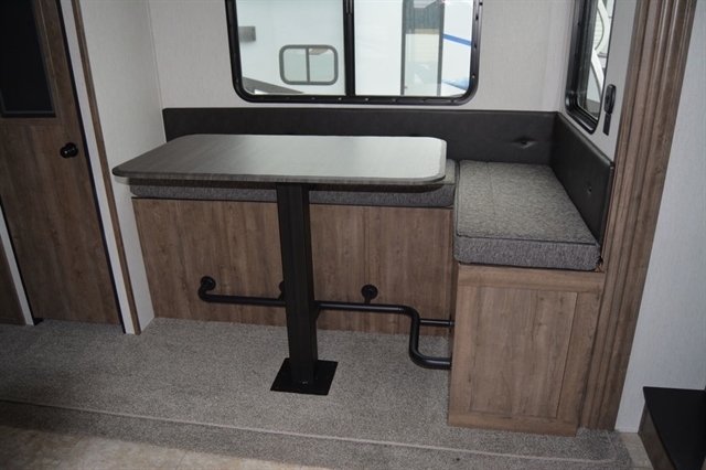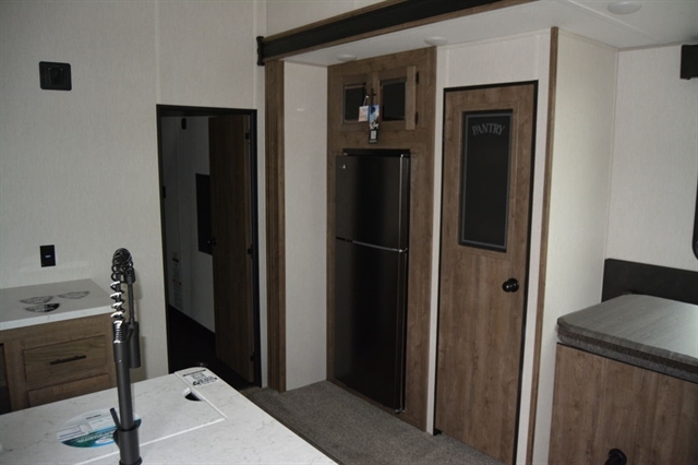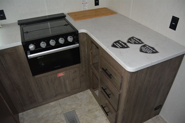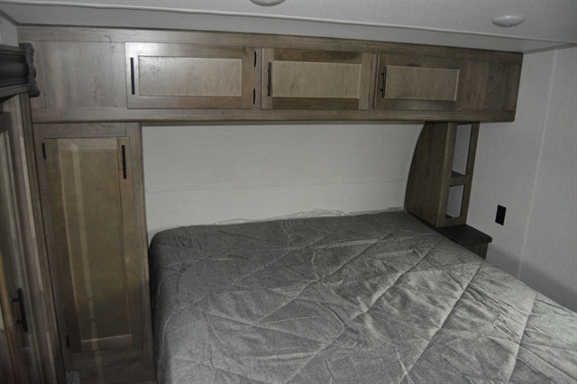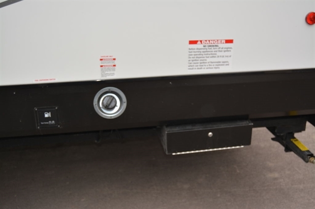 Luxury abounds in this stunning toy hauler! The kitchen features residential appliances, solid surface counter tops, stainless steel sink with pull-down sprayer, and ample storage. The high ceilings and extra tall main slideout really expand the already large space. The bathroom features a large glass shower, porcelain bowl foot flush toilet and linen closet. The bedroom features a power adjustable king bed, large dresser, front wardrobe, dedicated air conditioning and plenty of storage.