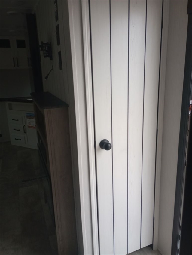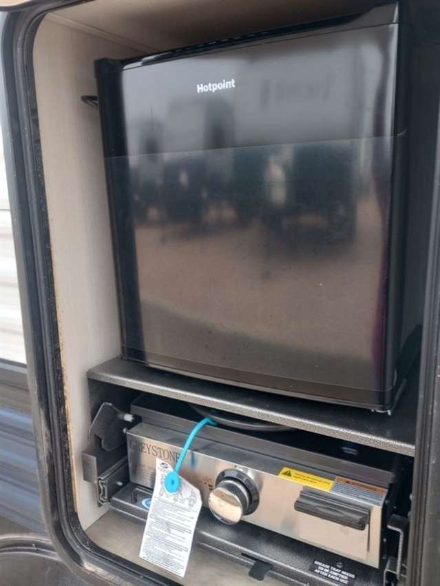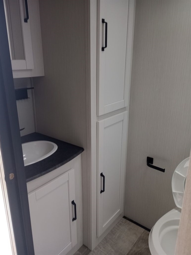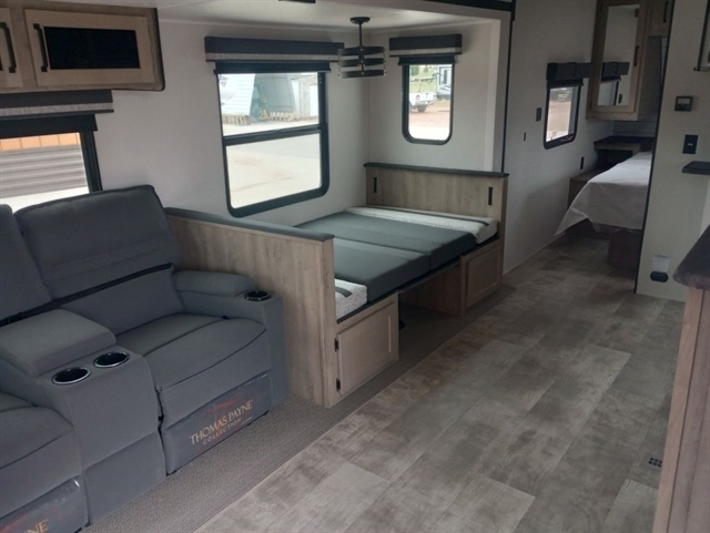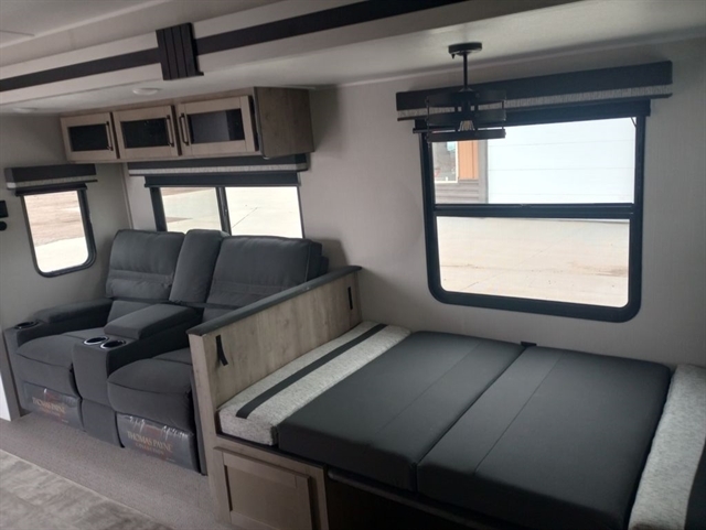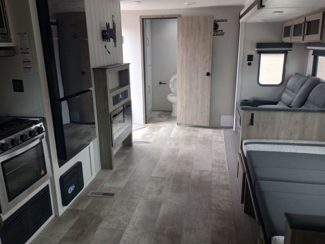 This rear bath travel trailer will provide you with a convenient entertainment space, filled with storage cabinets and room for seating on the dinette and sofa. The outside kitchen gives you the option to cook in the outdoors without having to be inside away from any festivities. The front of the camper has a full sized queen bed with shirt closets and night stands on each side.