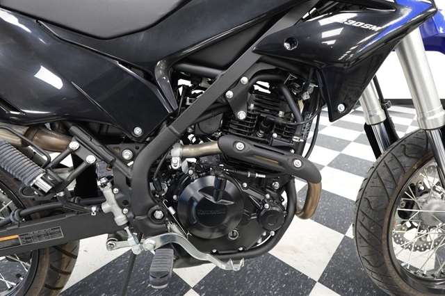 The KLX®300SM motorcycle is built with a slim, lightweight perimeter frame that’s maneuverable but rigid at higher speeds to help with straight-line stability. With the smaller front wheel, the caster angle (25°) and short wheelbase contribute to quick handling. Suspension performance offers 9.1 inches of travel up front and 8.1 inches in the rear, ideal for supermoto riding. The 43mm inverted cartridge-style front fork has adjustable compression damping to optimize fork performance for conditions and personal preference. The Uni-Trak® rear suspension offers bump absorption and rebound damping adjustability, and fully adjustable preload, allowing riders to tailor shock settings to personal preference. Substantial braking power comes thanks to a large 300mm semi-floating petal disc and twin-piston caliper up front and a 240mm petal rear disc and single-piston caliper. Agile supermoto performance is further enabled with 17-inch wheels and road tires contributing to better handling on the street.