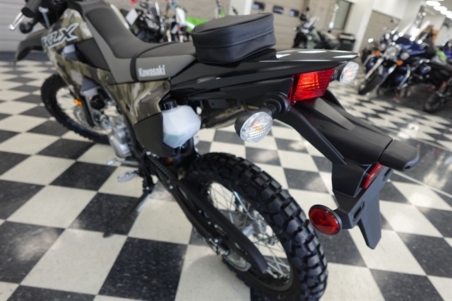 The KLX®300 dual-sport’s rider-friendly ergonomics closely align with the KLX®300R off-road motorcycle, offering an upright and relaxed riding position. Footpegs are positioned closer to the bike’s centerline for optimal riding comfort during on- and off-road excursions. Complementing adventure capabilities is a thick-padded seat that provides comfort on longer rides, while the 35.2-in seat height allows riders to comfortably reach the ground at stops for added confidence. The shroud design allows smooth transitions when shifting, enabling riders to feel more at one with their machine when cornering.