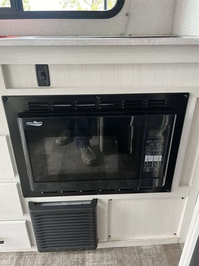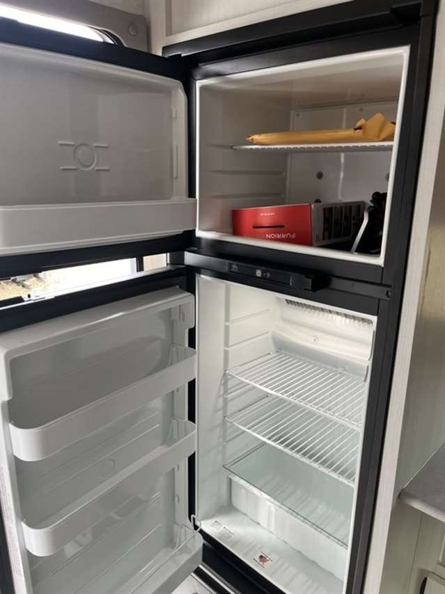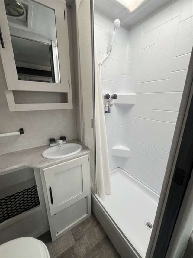 Walk around queen bed, a bathroom design with separate shower & toilet, 6 cu ft gas/electric refrigerator, massive kitchen pantry with adjustable shelves for tons of storage and sofa seating is the model customers have been asking for. Everything needed at about 3600 lb.