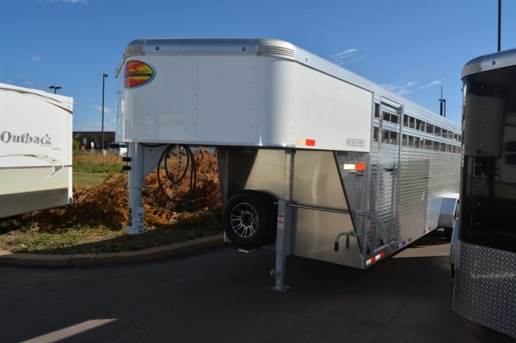 This V Nose Gooseneck Fifth Wheel Stock Trailer has air gaps that are Plexiglas ready.